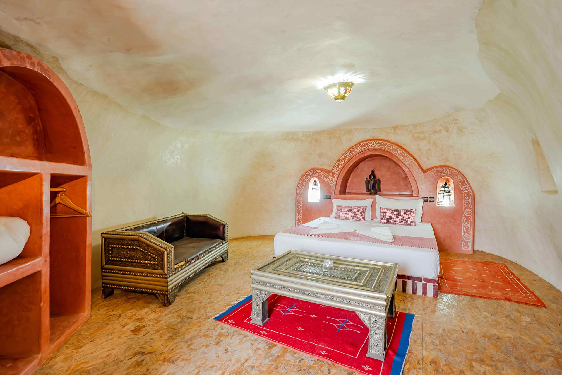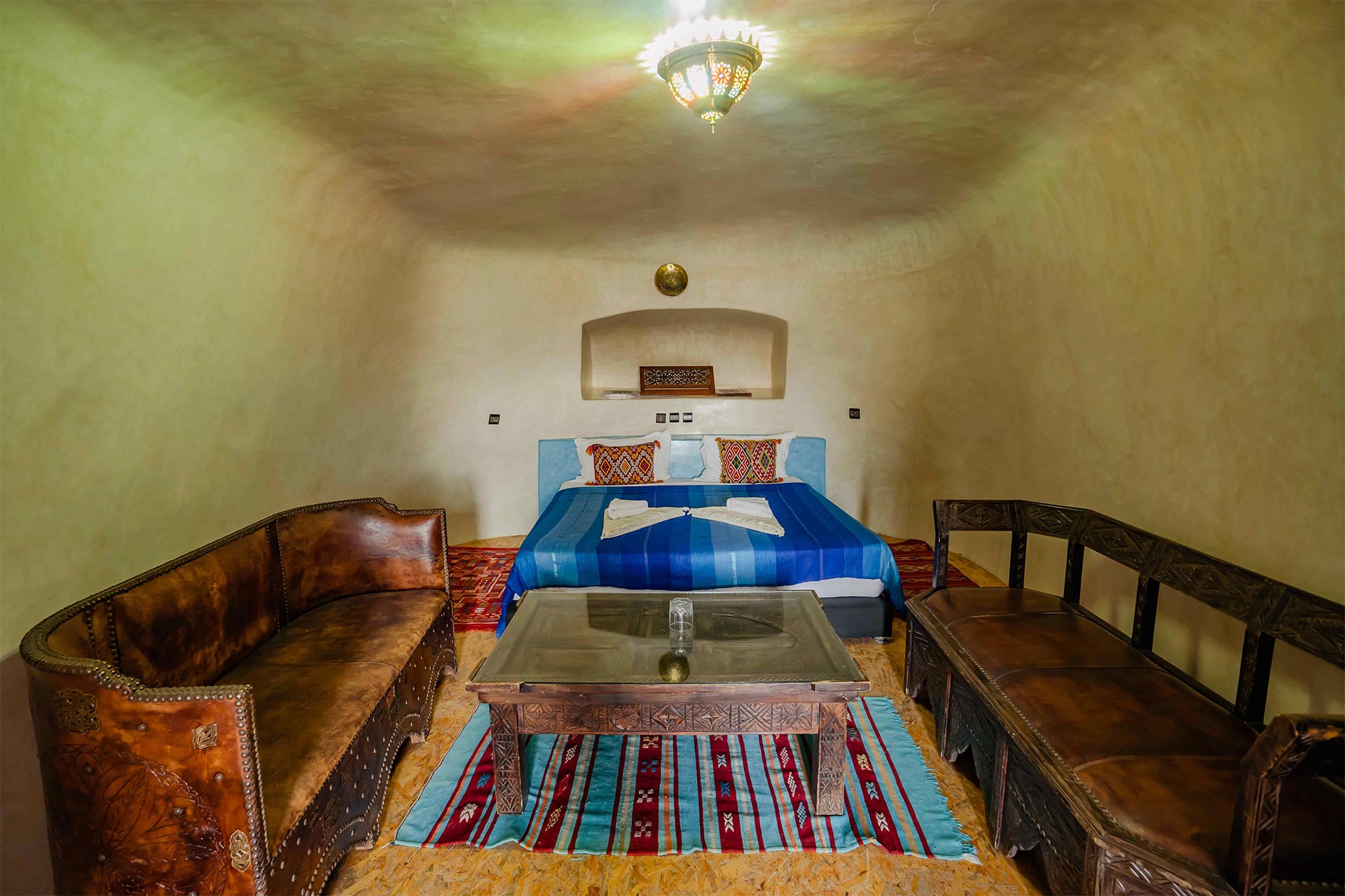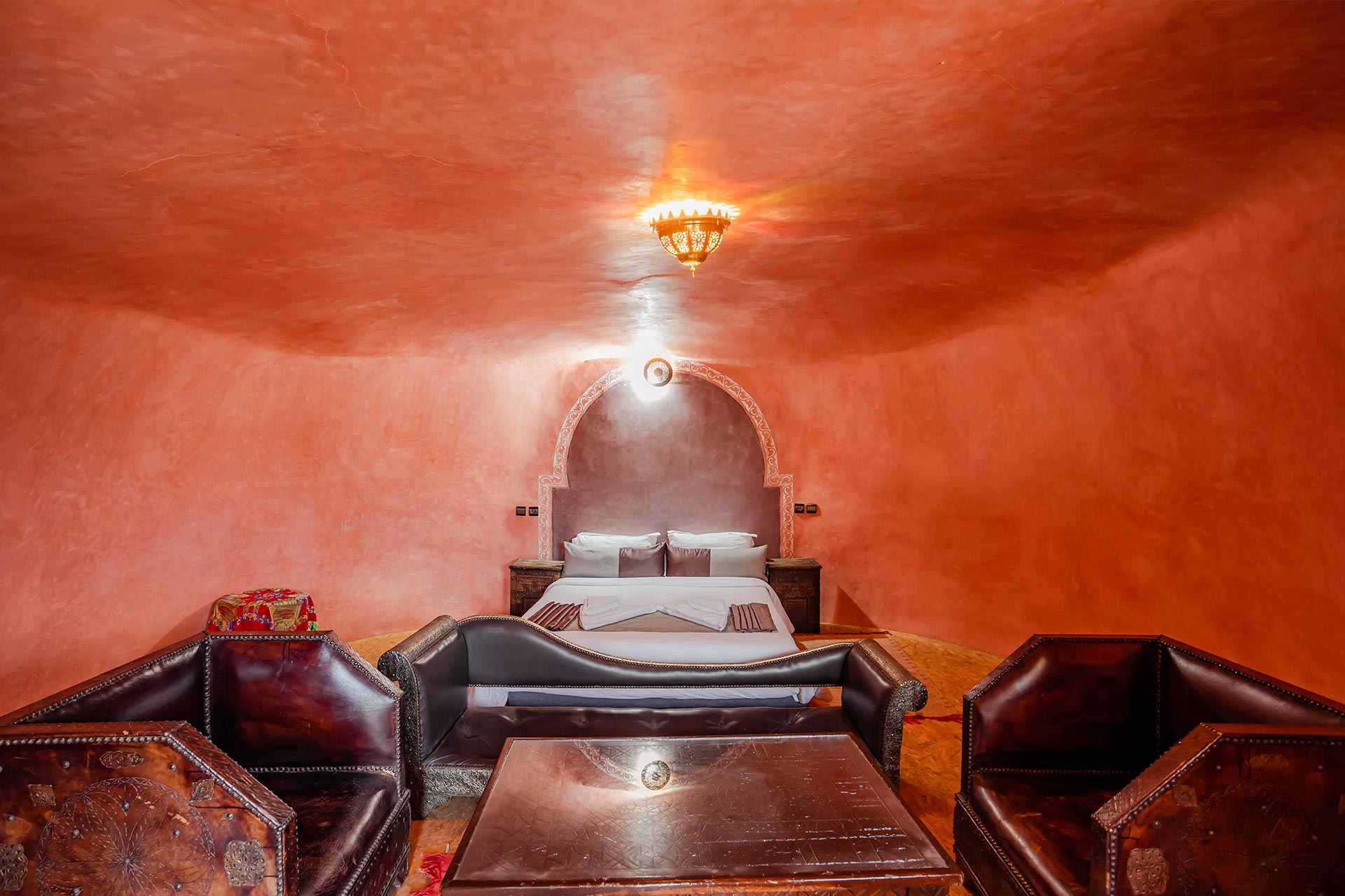 Nos CHAMBRES TROGLODYTES Deluxe représentent la quintessence de l’expérience troglodyte à La Kasbah Tizzarouine . ces chambres offrent une expérience incomparable, mêlant harmonieusement l’authenticité de l’environnement troglodyte avec des équipements haut de gamme. Chaque détail a été minutieusement repensé pour offrir un séjour exceptionnel, alliant une décoration élégante, des espaces généreux et une ambiance enveloppante.