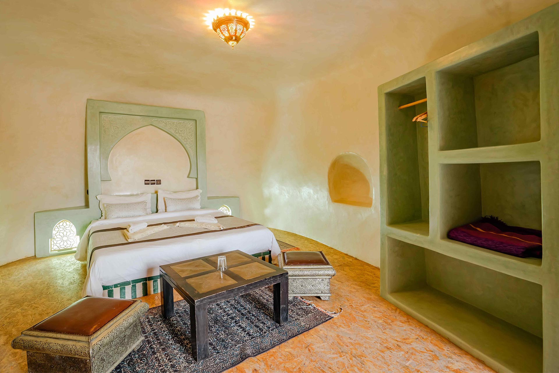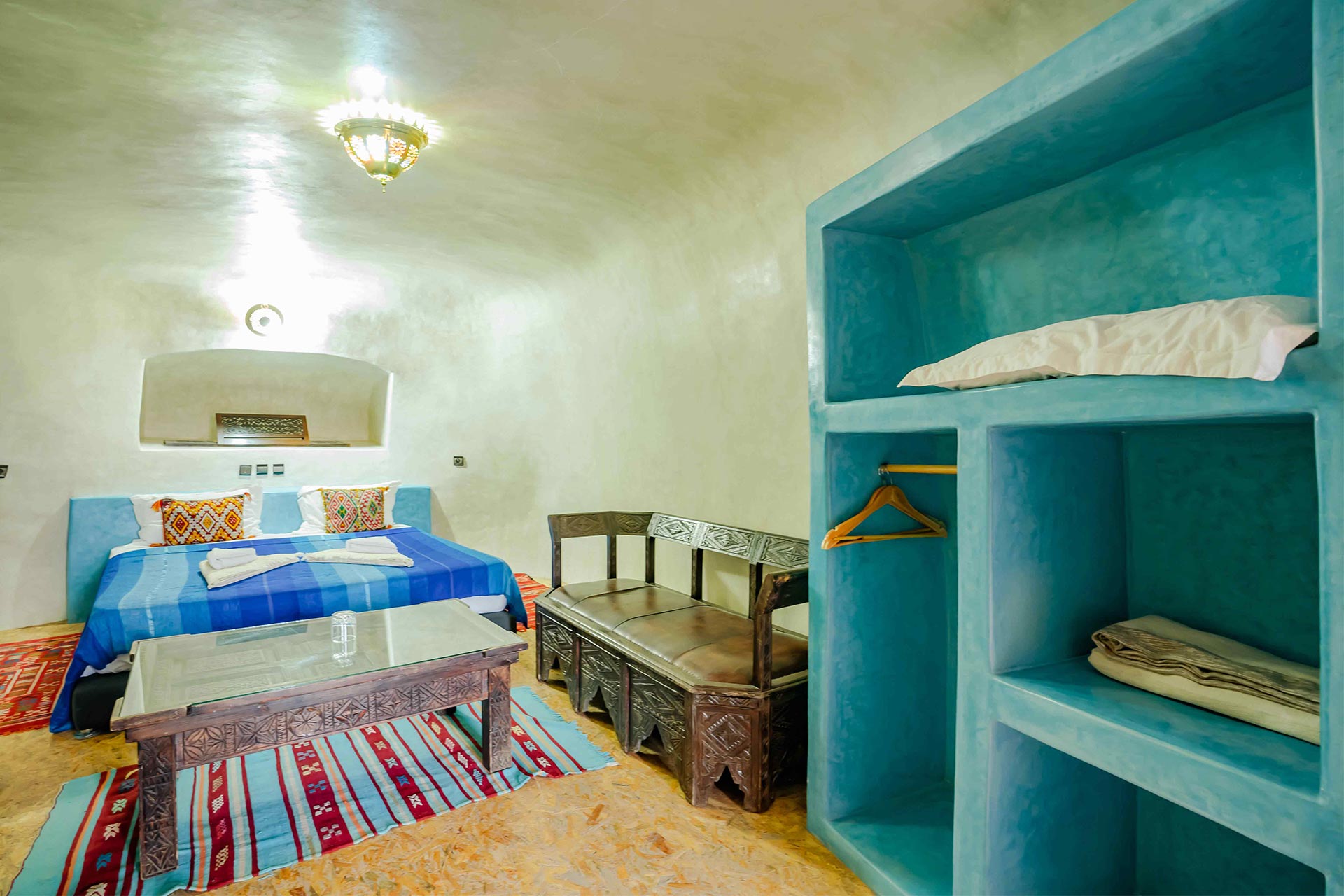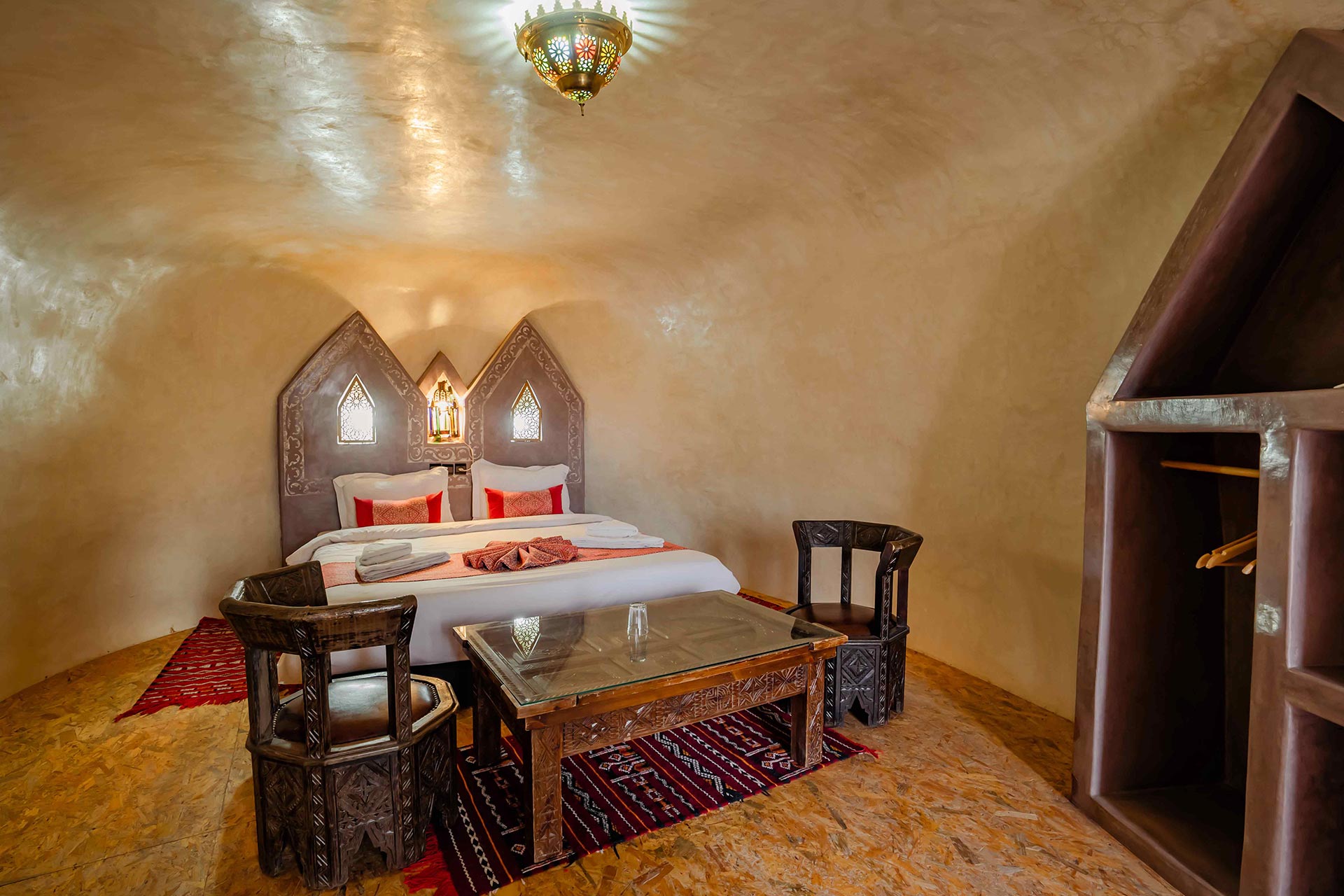 Nos CHAMBRES TROGLODYTES Deluxe représentent la quintessence de l’expérience troglodyte à La Kasbah Tizzarouine . ces chambres offrent une expérience incomparable, mêlant harmonieusement l’authenticité de l’environnement troglodyte avec des équipements haut de gamme. Chaque détail a été minutieusement repensé pour offrir un séjour exceptionnel, alliant une décoration élégante, des espaces généreux et une ambiance enveloppante.